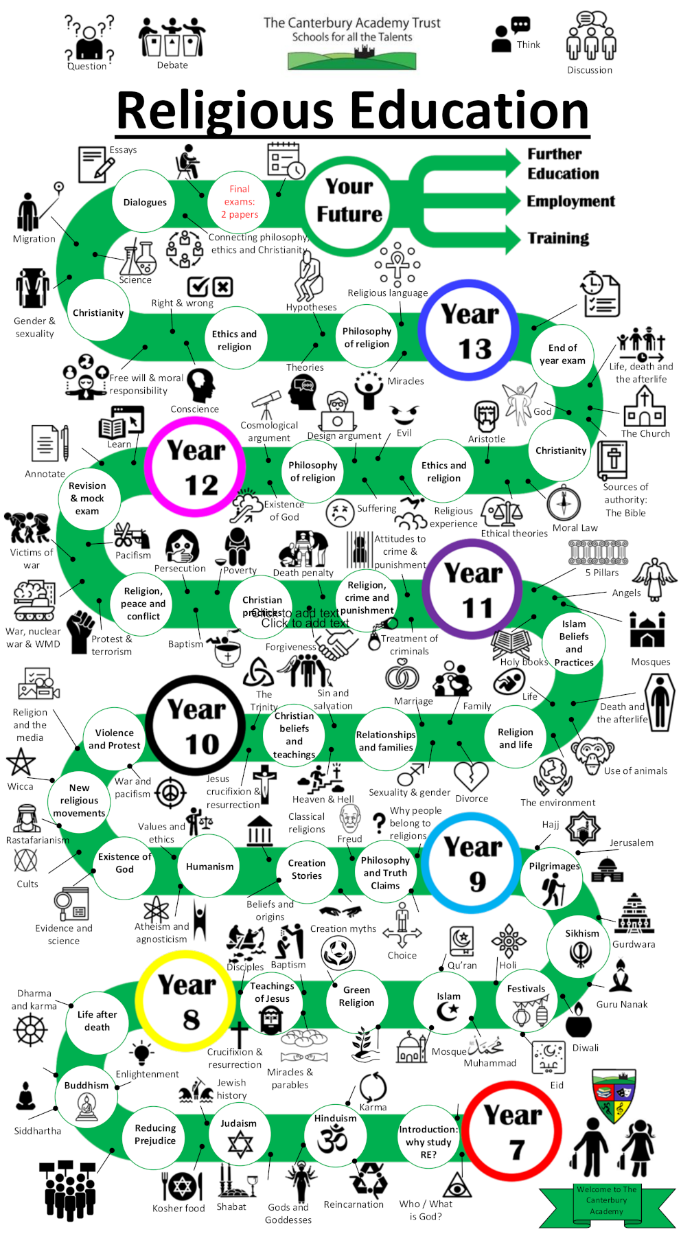 Studying RE at The Canterbury Academy enables our students to look at a wide variety of the different religious beliefs, values and practices found in the UK today. A key strength to studying RE is found not just in learning about the contrasting viewpoints and traditions in British Society today, but also in learning from them. As well as enriching a student’s own view on life, RE teaches core evaluating skills to consider and debate many of life’s deeper questions as well as complementing many of the other subjects which require an ability to think critically.