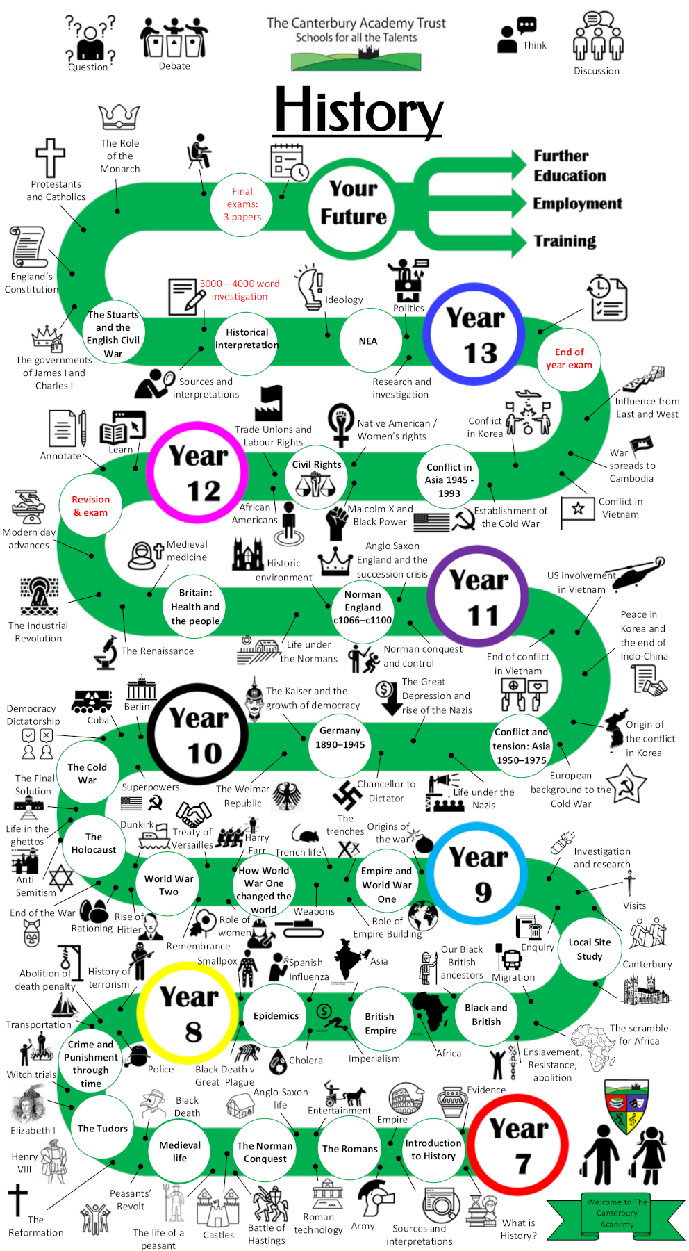 Our students begin their journey in Year 7 with a transitional unit focusing on key historical terms and skills which will ensure all students begin their journey with those important tools. Students will then progress through Years 7 to 9 with a journey across the last 2500 years, investigating key time periods like the Middle Ages or themes such as epidemics or Black and British.