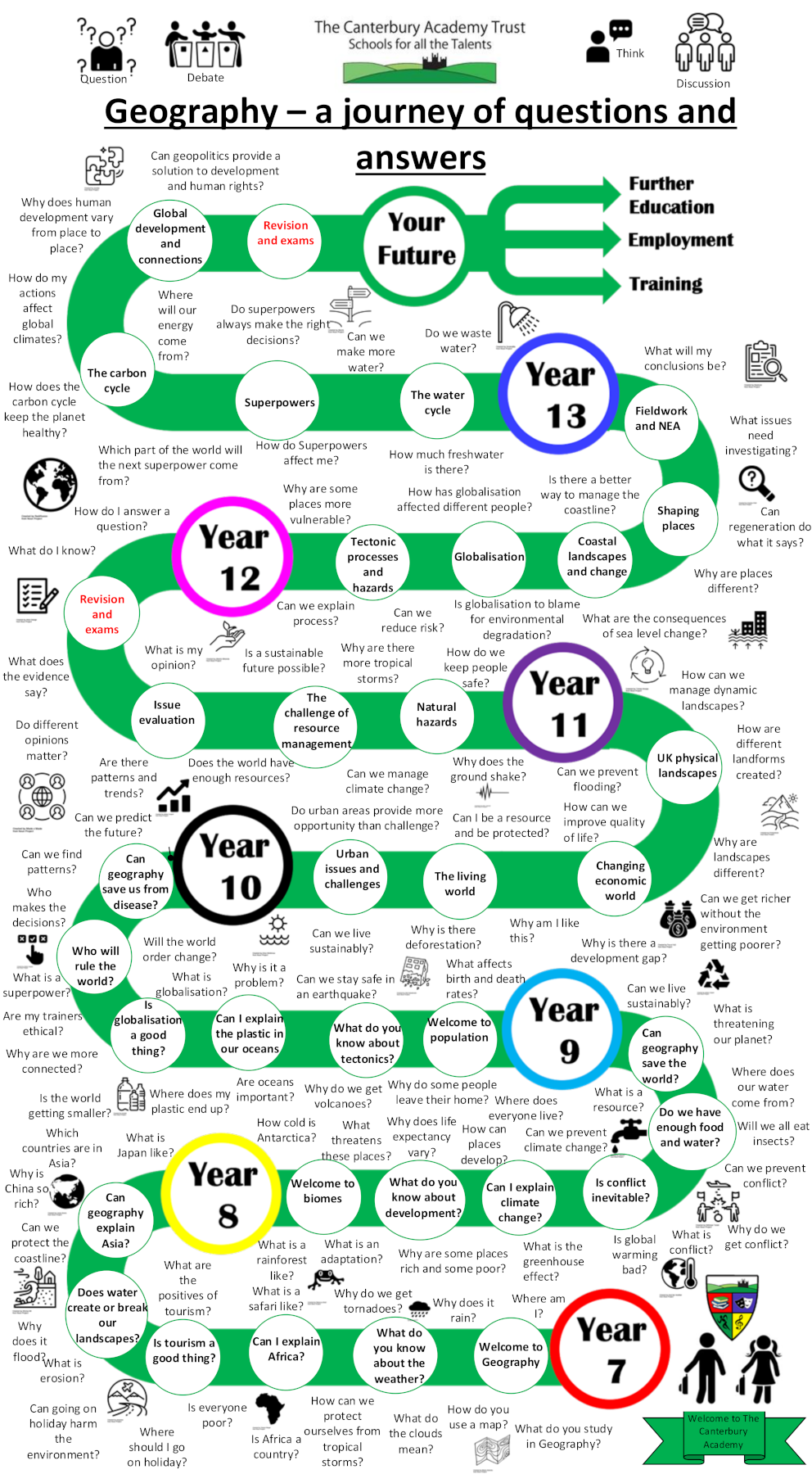 The Geography department intends to inspire young people to be inquisitive and passionate about the world and their place in it. We want students to become more curious and questioning of the places around them. We want students to become more informed, analytical, and reflective global citizens. Our curriculum at each key stage develops both knowledge and academic skills for the next stage in the students’ academic journey.