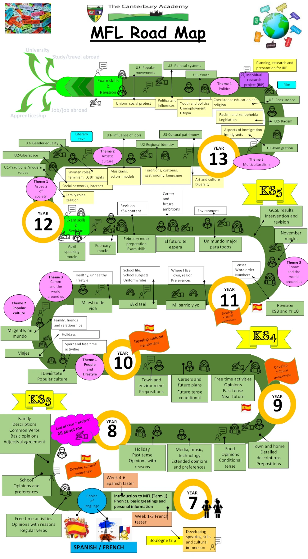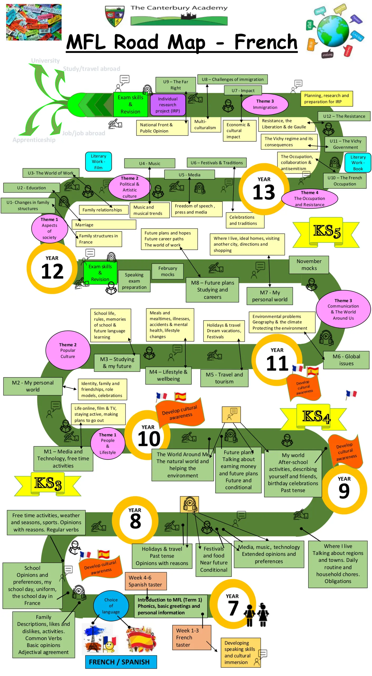 Students learn to understand and provide information and opinions about key themes relating to their own experiences and those of other people, including people in communities where French is spoken. We begin with topics familiar to learners, including family and friends, free-time activities, school, and technology in everyday life, before introducing subjects such as jobs and future ambitions, social and global issues, and life in French-speaking communities. Key pillars of our approach are encouraging maximum exposure and use of the target language and building upon our knowledge whilst constantly reinforcing and retrieving prior learning.