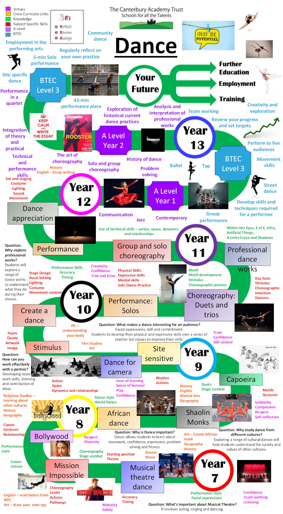 In Year 7 and 8 Dance at The Canterbury Academy the students have one lesson a fortnight in which they explore a new project each term, such as Mission Impossible, Bollywood, Street Dance, Musical Theatre, and Stomp. Students will build upon their dance skills and knowledge in each lesson as they learn about the topic through practical work. There are opportunities for the students to perform at the end of the project and show an audience what they have been learning about. Students will answer questions in class to show their understanding and will perform informally in groups to show their progress.