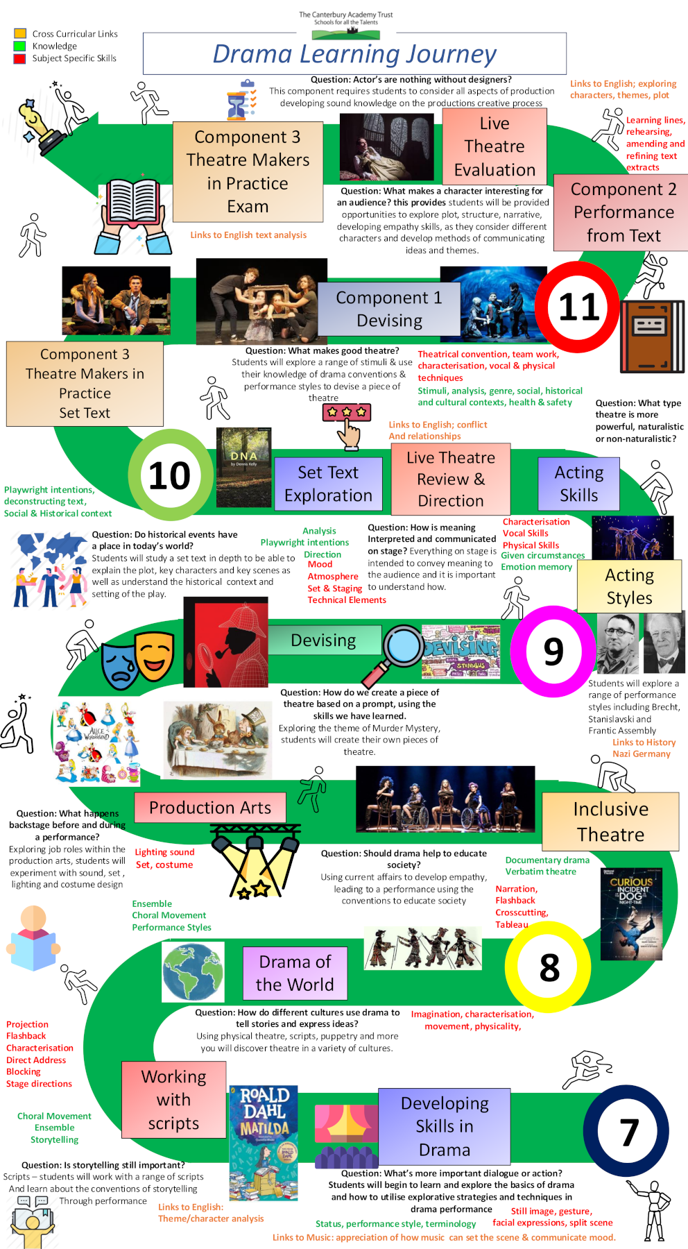 In Year 11, students refine their performance abilities and script analysis through Component 2, where they rehearse and present an extract from a published play. This builds directly on their script work from DNA in Year 9, allowing them to apply their understanding of character development and staging to a high-stakes performance. They also prepare for Component 3, the written exam, which requires them to critically analyse DNA and evaluate a live theatre performance. Their ability to assess performance elements, a skill nurtured in Year 9 through live theatre reviews, becomes essential here. Through these final assessments, students consolidate their journey, demonstrating creativity, critical thinking, and confidence in performance and analysis.
