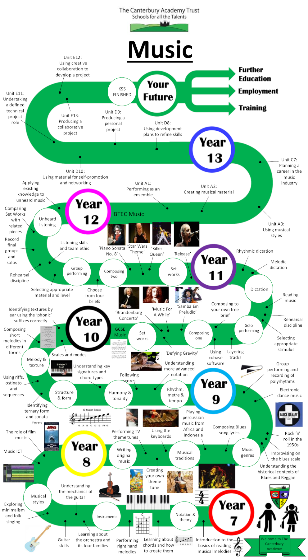 Music theory is delivered in an engaging way throughout, including in a whole module on chords during Year 7. We use performing and/or composing tasks during all units of work so that students can explore the various concepts for themselves in a creative manner. Learning strands that run through a number of units, such as melody, harmony, rhythm, dynamics, structure, and instrumentation, are specifically referenced as prior learning points and are recapped and built upon to allow knowledge to develop in a spiral fashion.