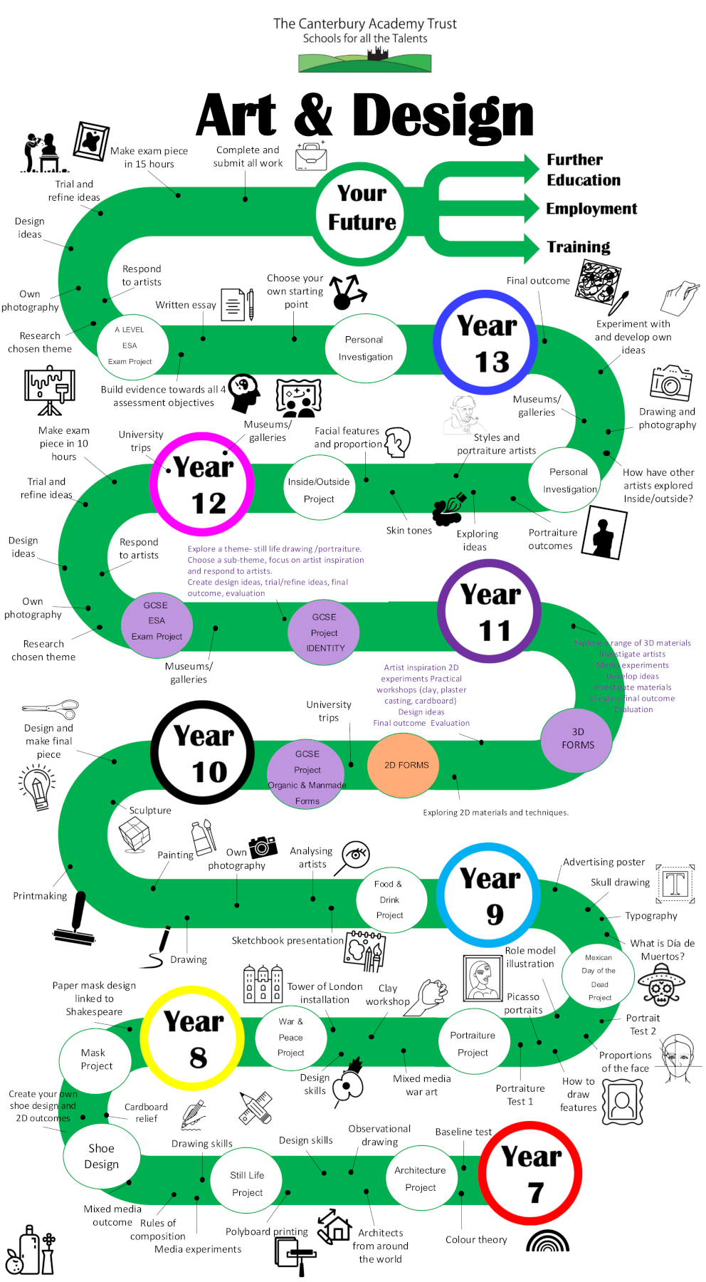 At The Canterbury Academy, we believe that every child is good at something. This extends to each of their creative abilities, whether that be drawing, painting, sculpture, or imagination and ideas. Through a varied curriculum we aim to introduce students to the vast world of visual language from throughout history, and around the world. Our goal is to inspire our young people to reflect, make, create, express, refine and explore. This subject teaches young people to experiment, make mistakes and achieve. Art and Design encourages self-expression and creativity and can build confidence as well as a sense of individual identity. Creativity can also help with wellbeing and improving health and happiness. Studying Art as a subject also aids the development of critical thinking and the ability to interpret the world around us.