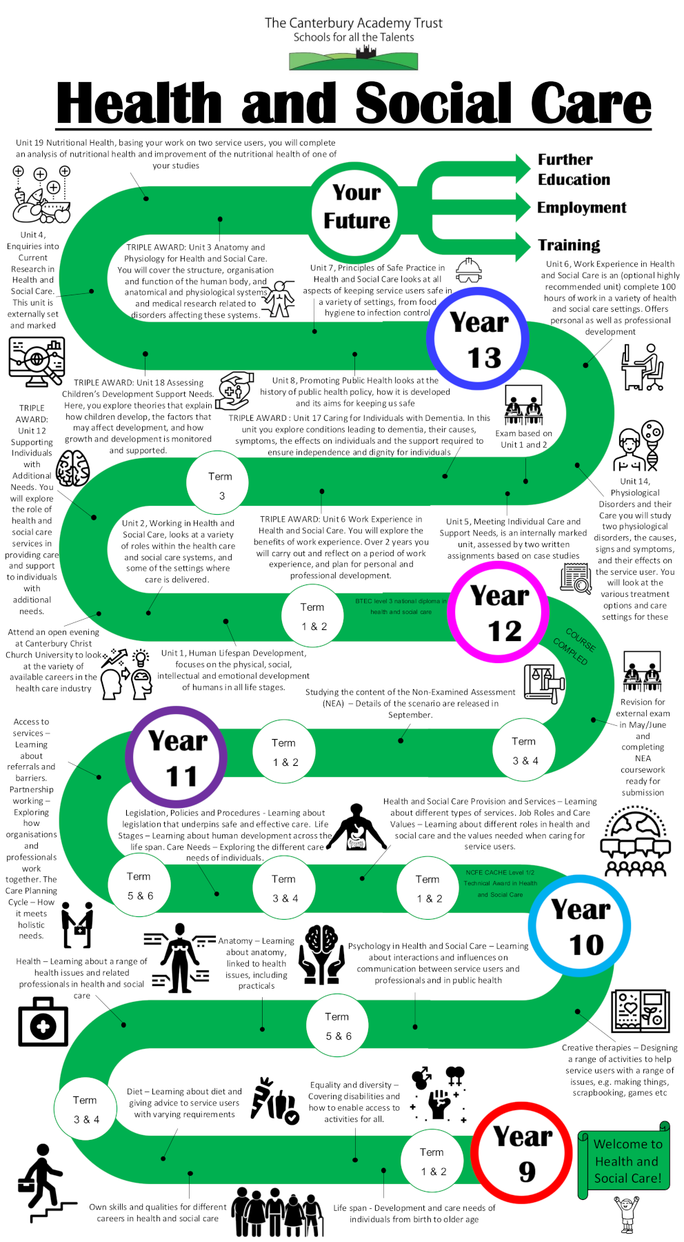 In Year 10 students learn about legislation, policies and procedures in health and social care. Students will learn individual care needs and understand how these are met through working in partnership with other professionals and implementation of care values.