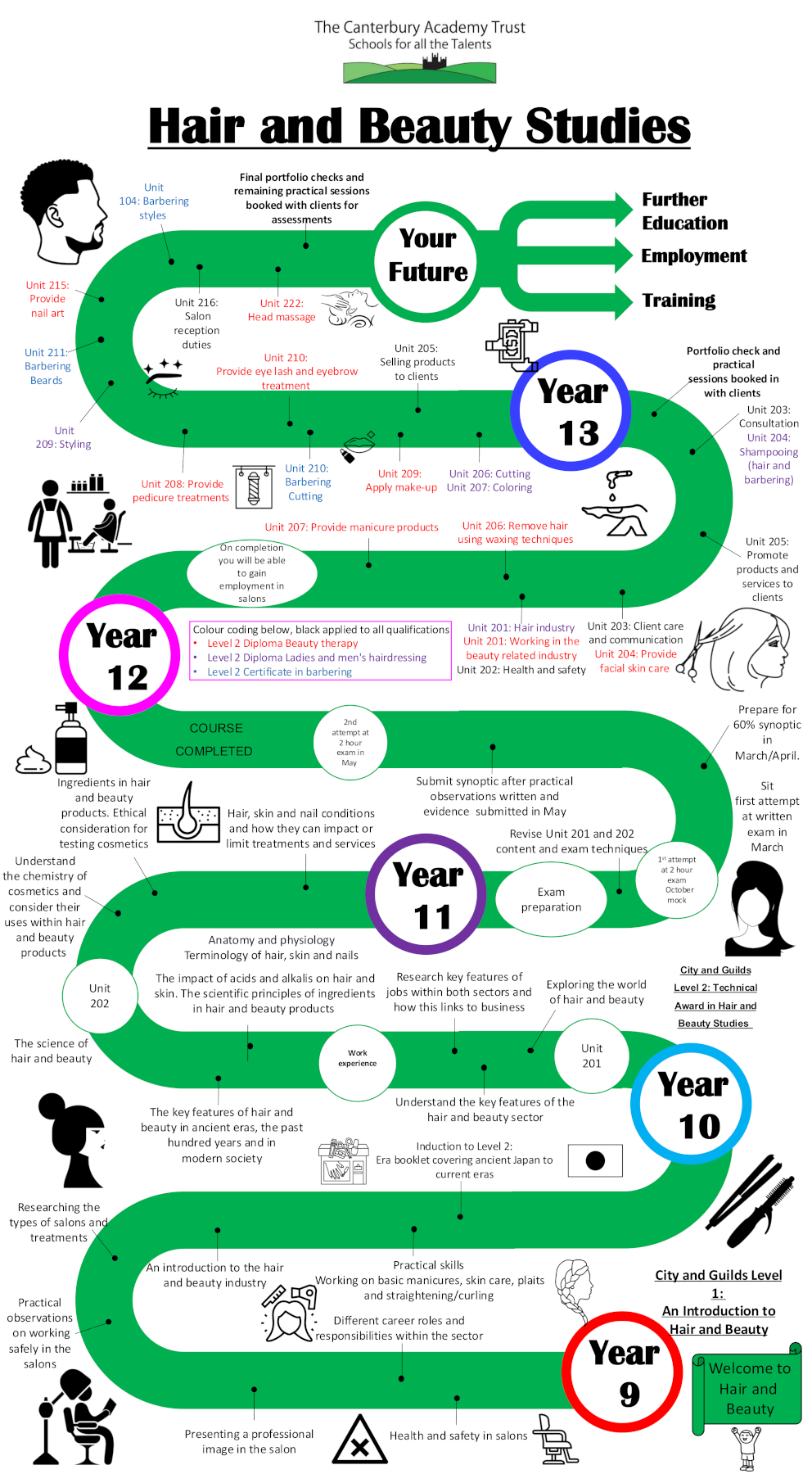 In Year 10 we offer students a technical award Level 2 Hair and Beauty (GCSE). This starts in Year 10 and is seen through to Year 11. Within the GCSE, students explore three different units, which are 201 exploring the world of the hair and beauty sector, 202 the science behind the hair and beauty sector, and lastly 203 designs within the hair and beauty sector. These three units are taught throughout Year 10 with tasks and assessments set in both theory and practical.
