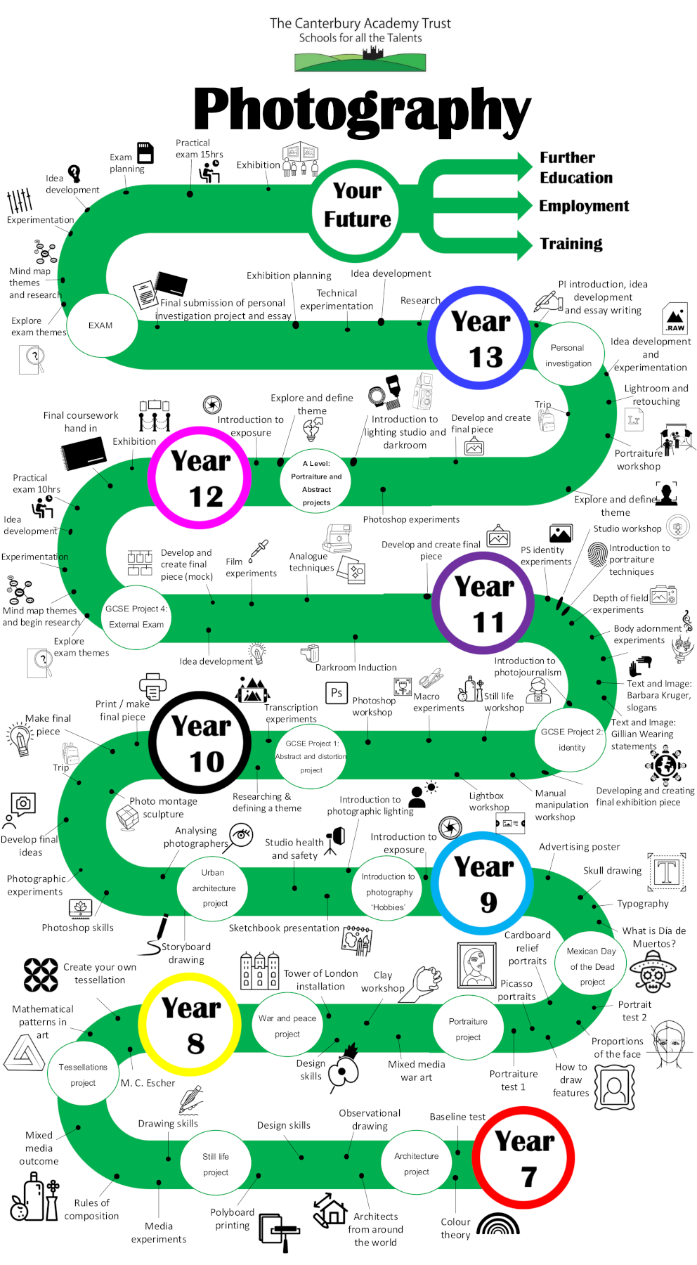 At The Canterbury Academy, we believe that every child is good at something. This extends to each of their creative abilities to communicate ideas visually through imaginative expression. Through a varied curriculum we aim to introduce students to the vast world of visual language throughout history, and around the world. Our goal is to inspire our young people to reflect, make, create, express, refine, and explore. This subject teaches young people to experiment, make mistakes and achieve. Photography and Design encourages self-expression and creativity and can build confidence as well as a sense of individual identity. Creativity can also help with wellbeing and improving health and happiness. Studying photography as a subject also aids the development of critical thinking and the ability to interpret the world around us.