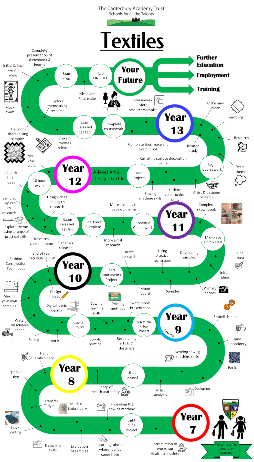 It is designed to encourage learners to develop a wide variety of practical textile skills from sewing machines to surface decoration along with creativity and imagination. It provides an opportunity for learners to experiment and take risks with their work while developing their own style.