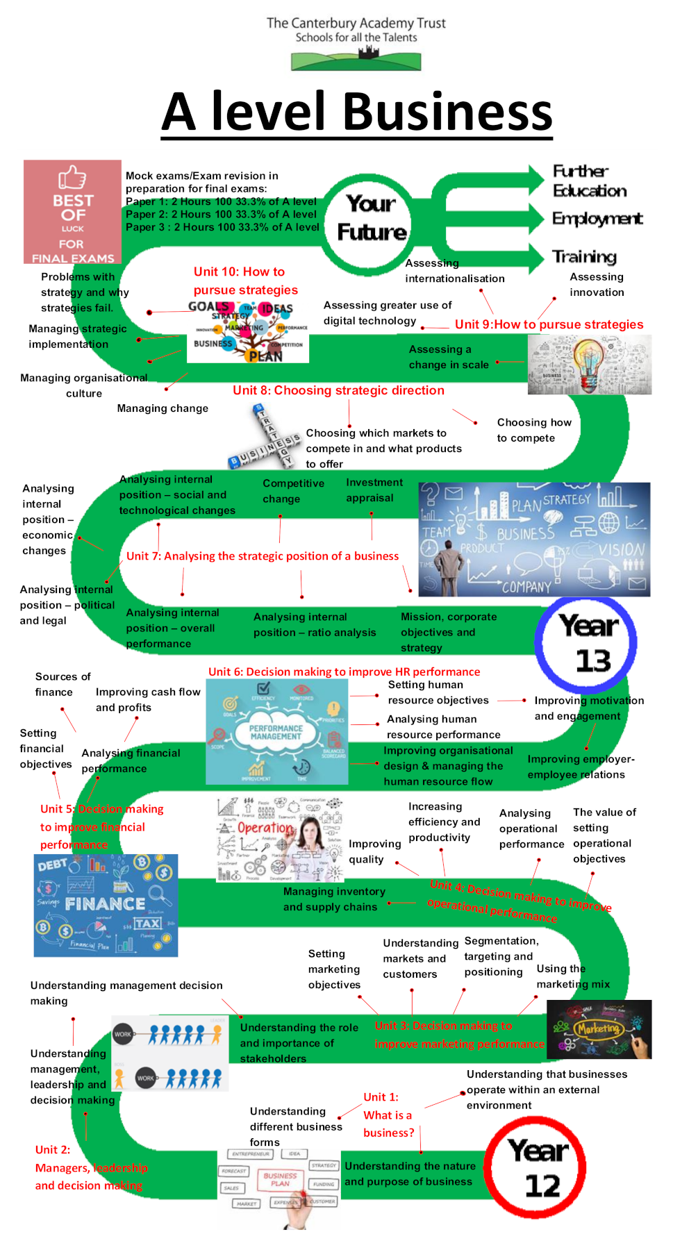 Topics are designed to develop the student curiosity and engagement with the subject through studying a variety of scenarios that entrepreneurs and employers find themselves in, for example, starting a business and assessing the impact of external factors. Students cover topics and themes that engages them with relevant and up-to-date business activity, which develops their commercial awareness. These topics, with some links to further study at KS4 and KS5, will allow students to appreciate the world around them and become more informed global citizens.