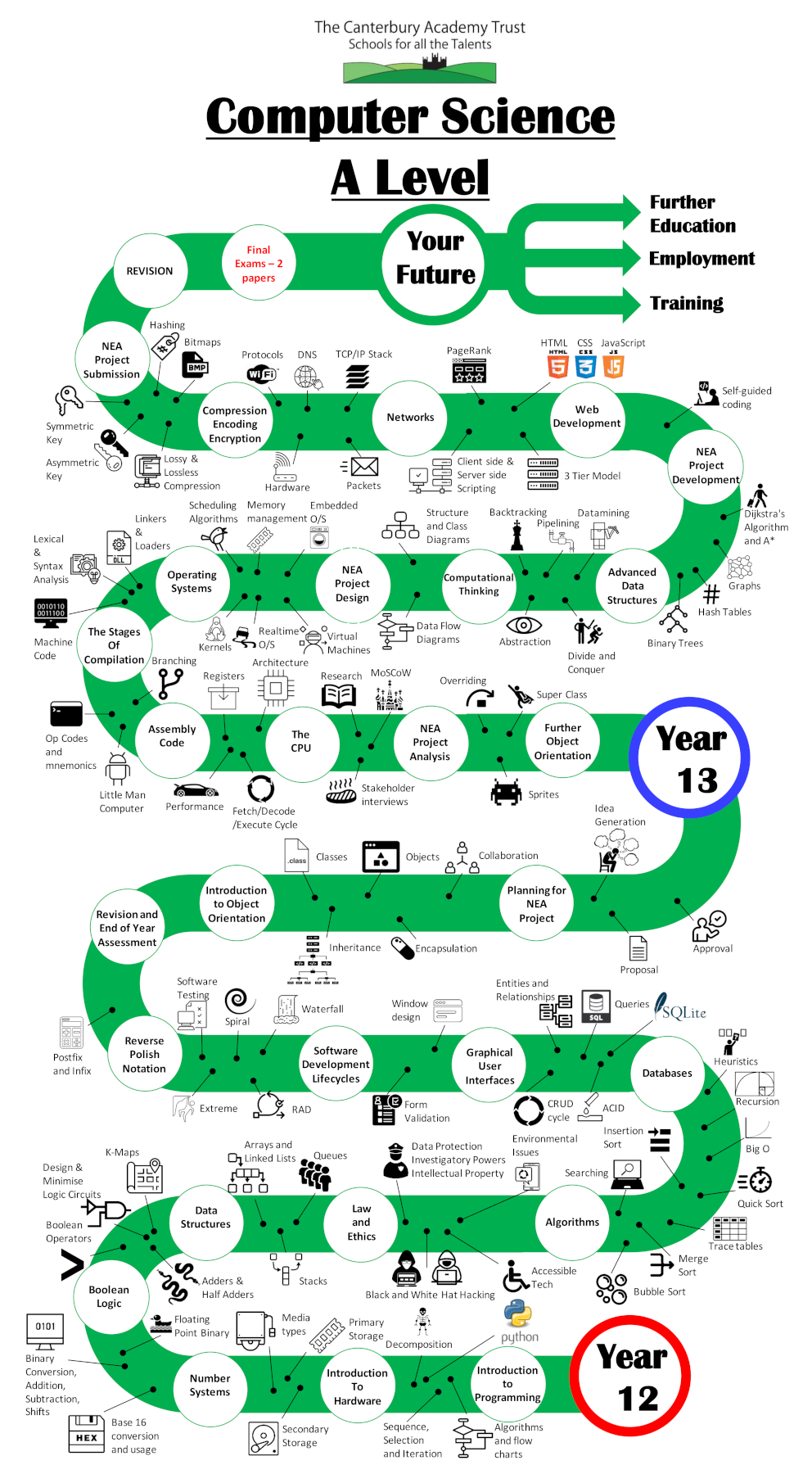 At KS5 students may continue in either the Computer Science or Vocational Computing pathway, or both if appropriate. Computer Science continues to A Level which provides a more in-depth exploration of the theory, underpinning algorithms and data structures and will learn the Object-Oriented programming paradigm. Students must also complete a software development project of their choice to demonstrate their practical abilities. This route has allowed past students to study Computer Science, Cyber Security and Games Development degrees.